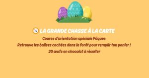 > Mercredi 22 avril 13h30 à 18h00 : Course d’orientation spéciale Pâques pour trouver les oeufs cachés dans la forêt. Réservation en ligne recommandée pour ajuster les quantités.