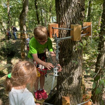 Activité Accrobranche sans limite de temps : équipement, briefing de sécurité, entrainement sur parcours test, et activité en autonomie dans les parcours (supervision des parents, surveillance des opérateurs).